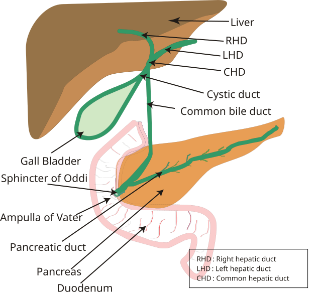 “Labeled biliary tree diagram showing hepatic ducts, common bile duct, gallbladder and pancreatic duct”