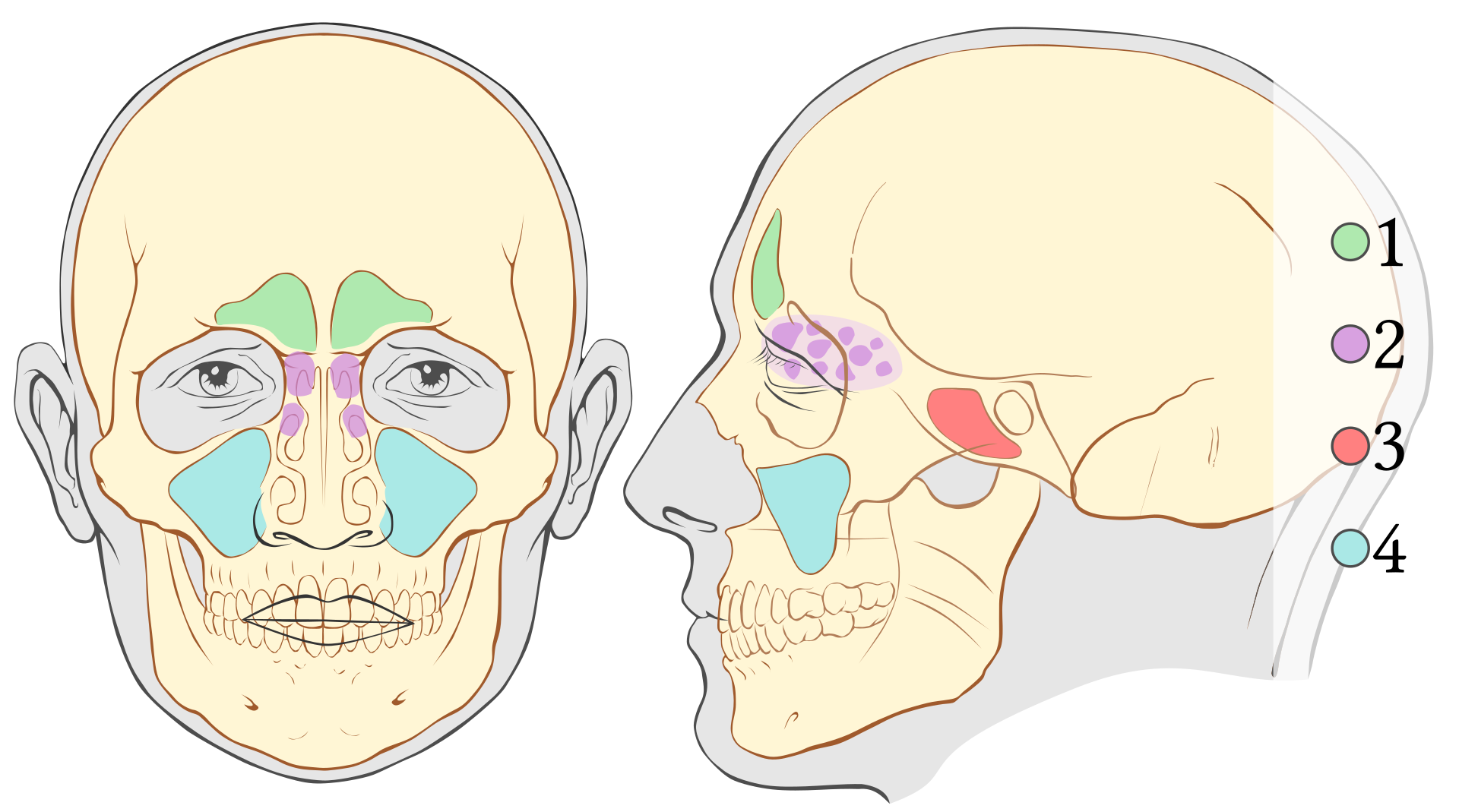 Labeled diagram of paranasal sinuses implicated in viral and bacterial rhinosinusitis
