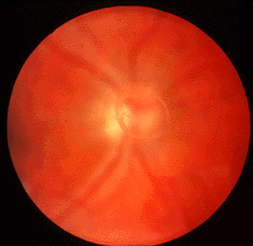Color fundus photograph of a normal left retina showing optic disc and vessels.