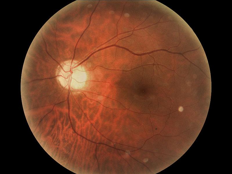 A normal fundus photo for baseline context; floaters usually aren’t visible on photos because they’re internal shadows on the retina.