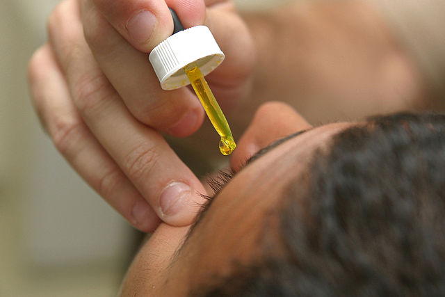 Clinician performing a slit-lamp eye examination with fluorescein dye.